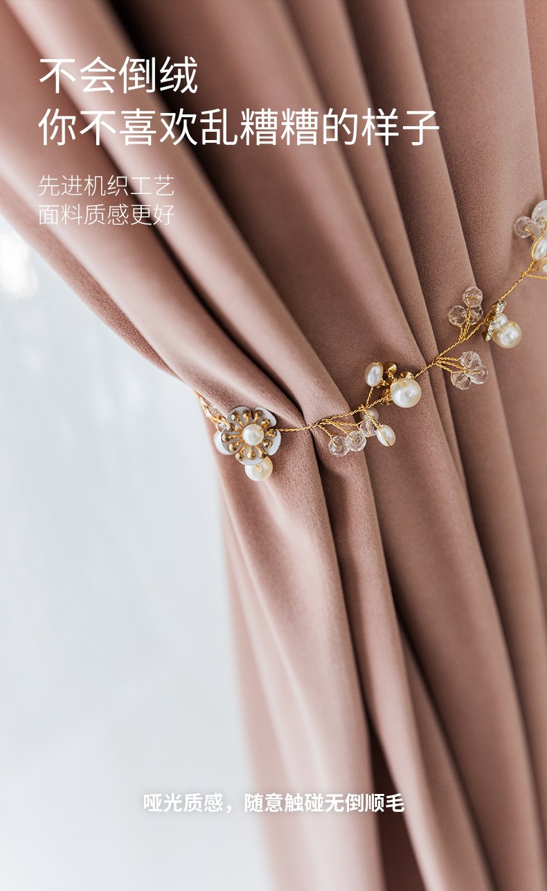 金蝉の特注カーテンの布は軽くて贅沢です。北欧風の少女ピンクのビロードの寝室のカーテンの遮光色の備考(麦芽粉の汚れた粉のローランの粉)1メートルの材料価格(フック/穴あけ無料加工)は何メートルの撮影を必要としますか?